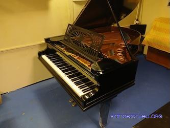 Pianoforte a coda costruito da Hansmann attorno agli anni '20. Lo strumento è dotato di meccanica a doppio scappamento, con una estensione di 88 tasti. La meccanica risponde molto bene ed il suono può essere ben modulato. La concezione totalmente moderna dello strumento lo rende adatto anche per lo studio avanzato. L'accordatura può tranquillamente essere effettuata a 440hz: arpa in ghisa e somiere sono in ottime condizioni. La tavola è priva di crepe aperte ed è estremamente sonora. Il pianoforte è di colore nero lucido, perfettamente in stile Art Decò. Lo strumento ha recentemente beneficiato di una rinfrescata ed è quindi, esteticamente, molto piacevole. La tastiera è originale in avorio/osso. La sonorità è piena e rotonda nei bassi, corposi nonostante le piccole dimensioni, e si accende nell'ultima ottava con una timbrica brillantissima. Strumento molto godibile, da provare. |