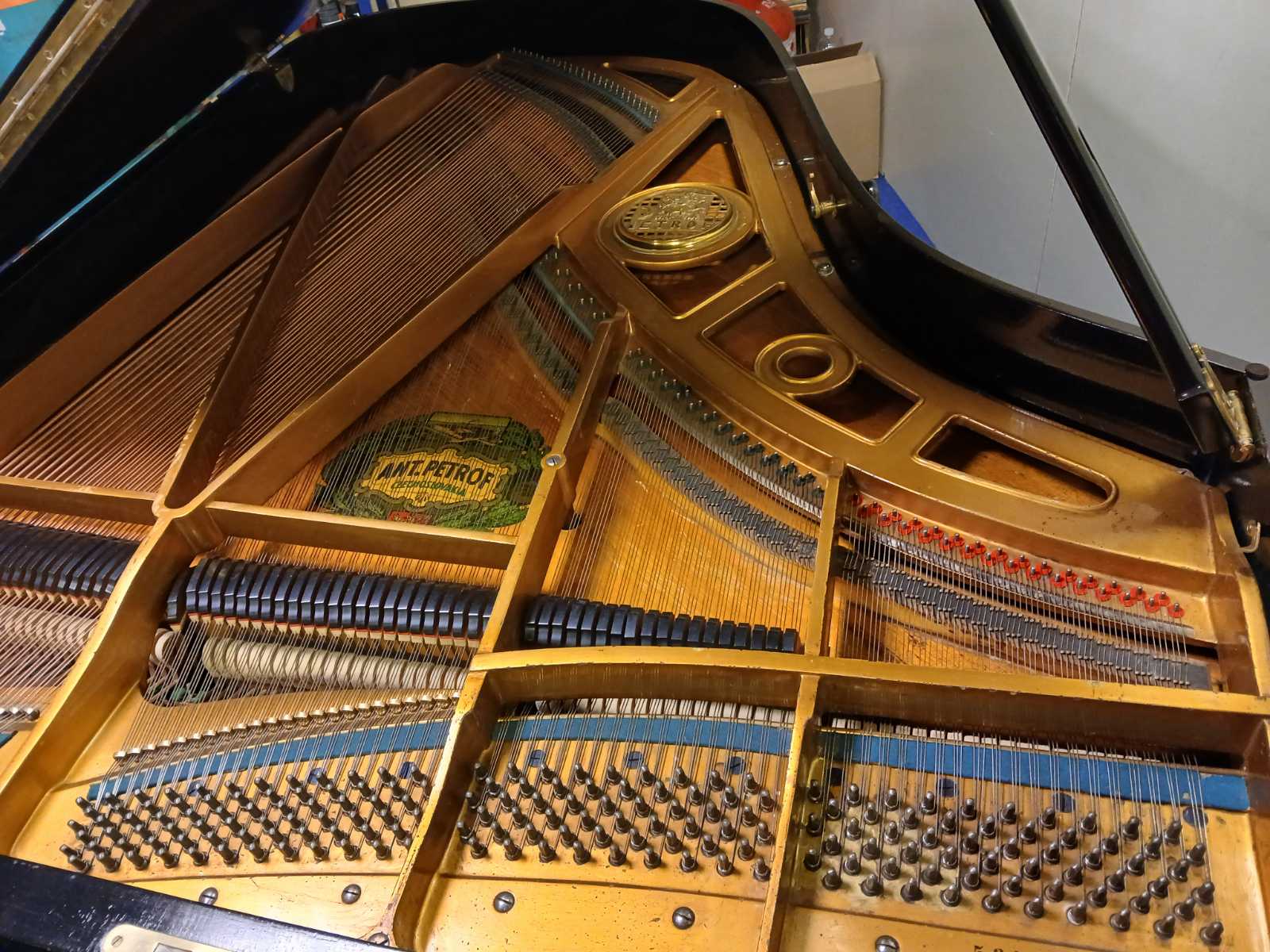 Bellissimo pianoforte a coda costruito da Petrof sul finire dell'800 (numero di serie 7827). Lo strumento è rifinito con una bellissima impiallacciatura in noce, ricca di venature e sfumature di colore. L'eleganza del mobile è sottolineata dalla tastiera in avorio e dalla pedaliera elegamente intagliata. L'estensione della tastiera è di 88 note. La meccanica, priva di doppio scappamento, è tuttavia molto performante: di tipo 'a spillo', assai simile alla meccanica classica adottata dalla Bluthner. La sonorità è dolcissima e al contempo avvolgente. Davvero una chicca l'espressività e il colore del suono. Adattissimo per la musica classica, lo strumento può trovare spazio anche per la musica moderna. Petrof è fra i più rinomati costruttori di pianoforti. La casa è stata fondata nel 1864 da Antonin Petrof, nato a Hradeck Kràlové, nell'odierna Repubblica Ceca. Antonin imparò la costruzione dei pianoforti presso suo zio, Jan Heitzmann, a Vienna. |